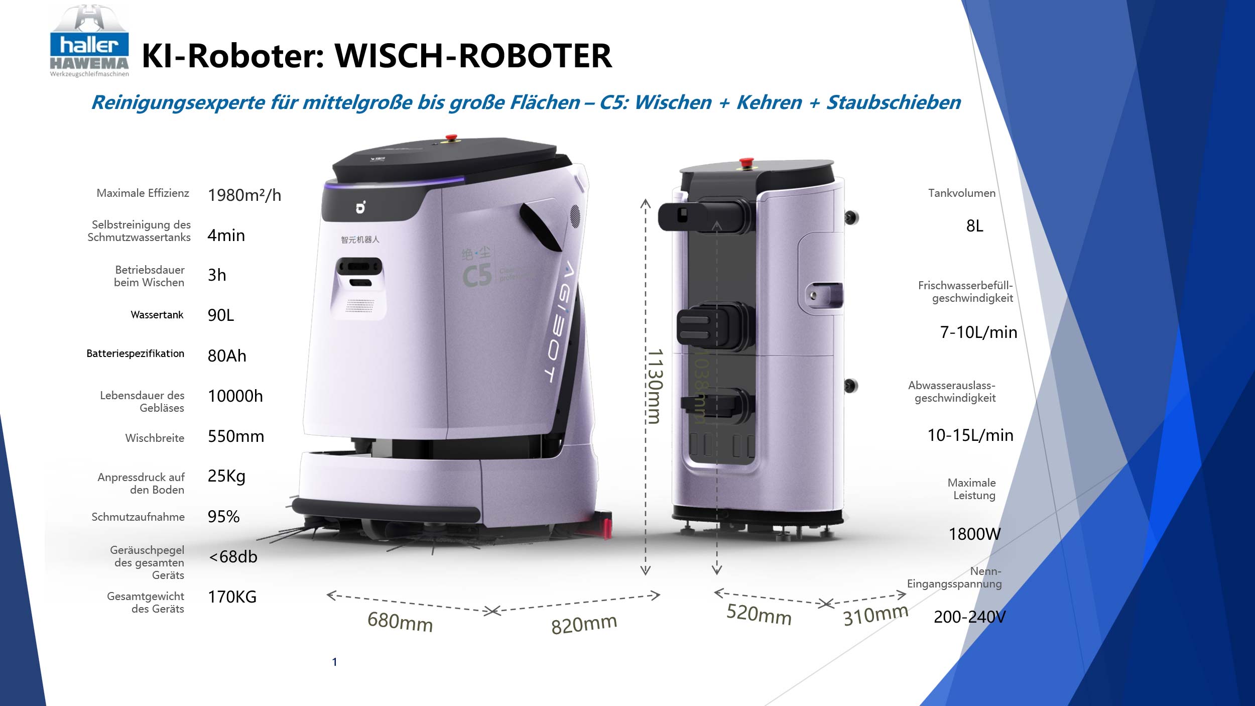 Wenn es um die zuverlässige und effiziente Reinigung mittelgroßer bis großer Flächen geht, setzt der KI-Wischroboter C5 neue Maßstäbe. Entwickelt für höchste Ansprüche in Industrie, Logistik, Verwaltung und öffentlichen Einrichtungen, vereint er modernste KI-Technologie mit außergewöhnlicher Leistungsfähigkeit.